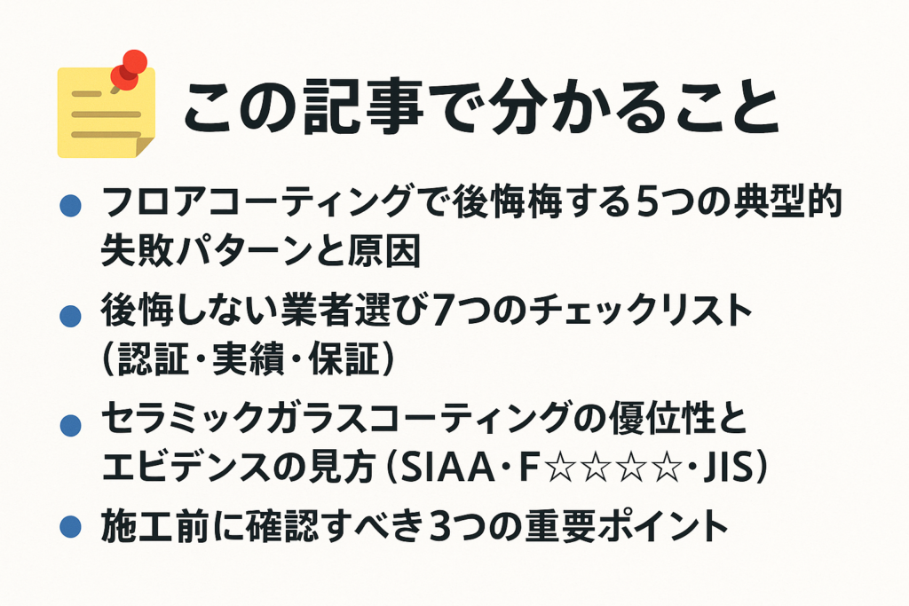 これらのポイントをすべて押さえることで、後悔のないフロアコーティング選びが可能になります。特に、価格だけで判断せず、認証・実績・保証を総合的に評価することが、長期的な満足度につながります。