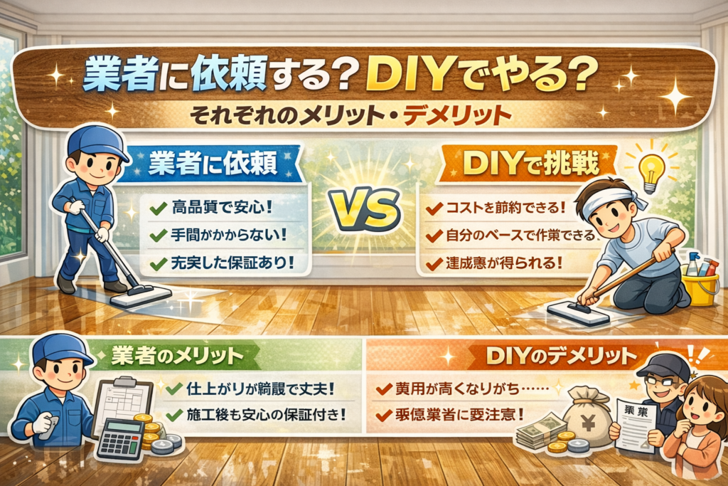 フロアコーティングを検討する際、専門業者に依頼するか、それとも自分でDIYに挑戦するかは大きな分かれ道です。ここでは、それぞれの選択肢が持つメリット・デメリットを比較し、後悔のない選択をするための具体的な情報を提供します。