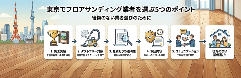 床サンディングの仕上がりは、業者の技術力と経験に大きく左右されます。費用だけで選んで後悔しないために、以下のポイントを軸に業者を比較してください。