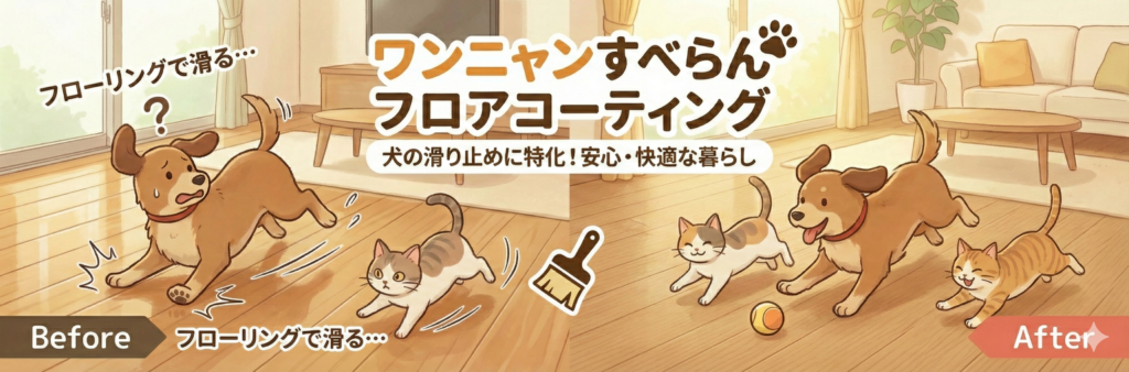 東京エリアで犬の滑り止め対策としてフロアコーティングを探している飼い主様の間で、近年特に注目を集めているのがワンニャンすべらんフロアコーティングです。一般的なフロアコーティングと何が違うのか、順を追って説明します。